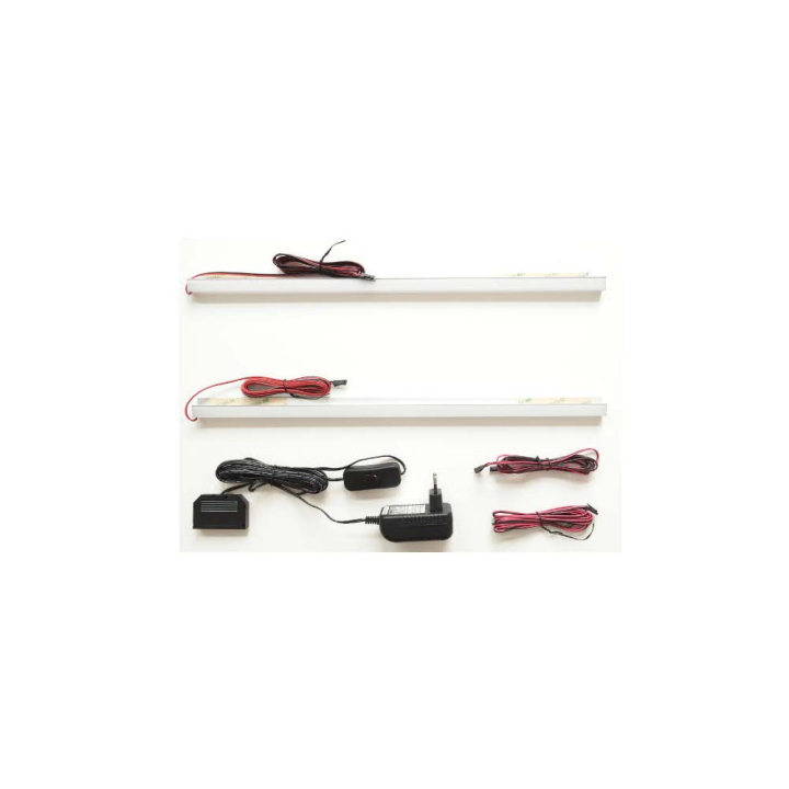 Комплект от 2 LED ленти с ширина 40 см. Изключително икономични и много лесни за монтаж с обща консумация от 7.8 W. В комплекта освен 2 осветителни тела са включени трансформатор, както и захранващ кабел. С тези осветителни тела много лесно ще направите атмосферата в помещението по-приятна и красива. Диодите осветяват в топла светлина (3000 К) с интензитет 365 лумена, като подчертават сиуетите на предметите във витрината. Освен по-видими всички ценни вещи поставени в нея, като статуетки, вази, чини стават още по-атрактивни. С допълнителна поръчка може да добавите дистанционно управление с мемори функция и димер. Комплектът е предназначени за вграждане във витринен шкаф към луксозна колекция мебели Филаделфия.