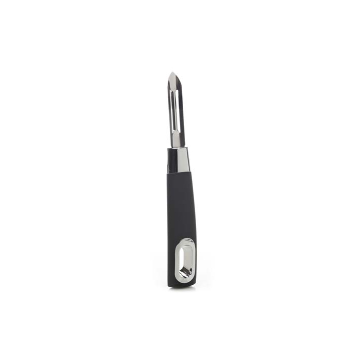 Белачка за зеленчуци от неръждаема стомана с черна ергономична дръжка и отвор за закачане, 20.10 см