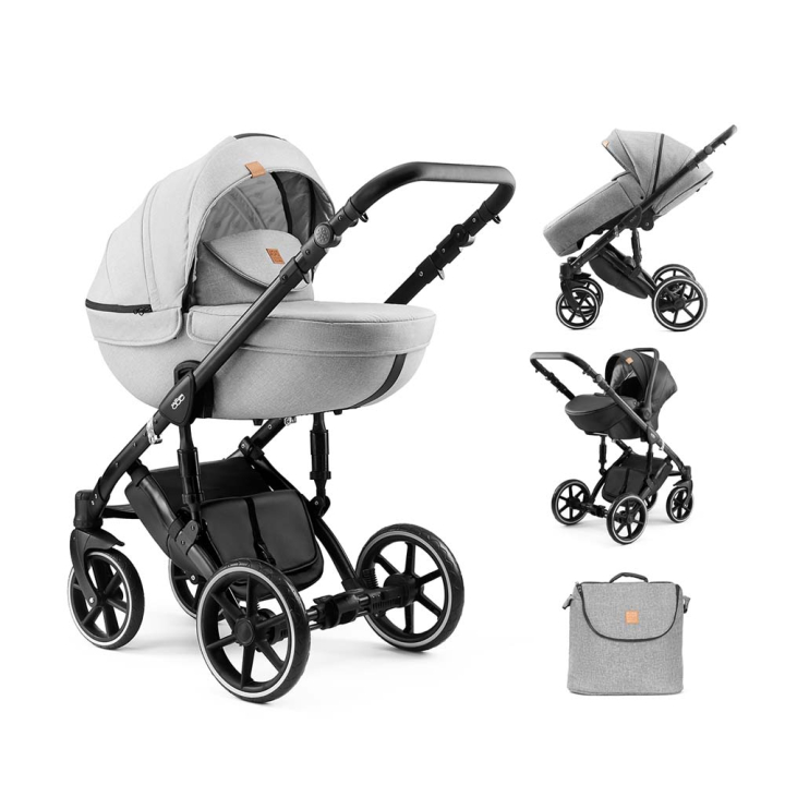 Комплектът включва: алуминиева рама, кош за новородено, летен кош с покривало за крачетата, стол за кола от група 0 (0-13 кг), стилна чанта за принадлежности , универсален дъждобран за двата коша, универсален комарник.