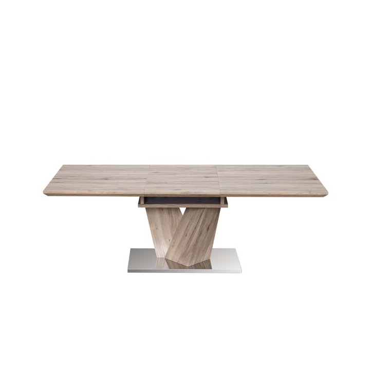 Разтегателна трапезна маса с размери Ш:160-220/Д:90/В:76 см. Моделът се характеризира с голям разтегателен плот, който може да достигне ширина до 220 см и да настани от 4 до 8 човека. С тази маса никога няма да се притеснявате къде да настаните гостите и любимите хора за приятни беседи и вкусна консумация на храни и напитки. Моделът се отличава с уникална конструкция от два продълговати модула, поставени върху метална основа, която ще ви впечатли със своята визия и декорация.