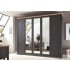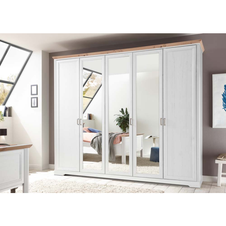 Петкрилен гардероб с 3 огледални врати, с размери Ш:266/Д:64/В:220 см. Отличава се с красив дизайн, като крайните елементи на гардероба са елегантно фрезовани, а вратите са стилно оформени с рамка. Металните дръжки в стил антик, напълно се вписват в цялостната визия на гардероба.