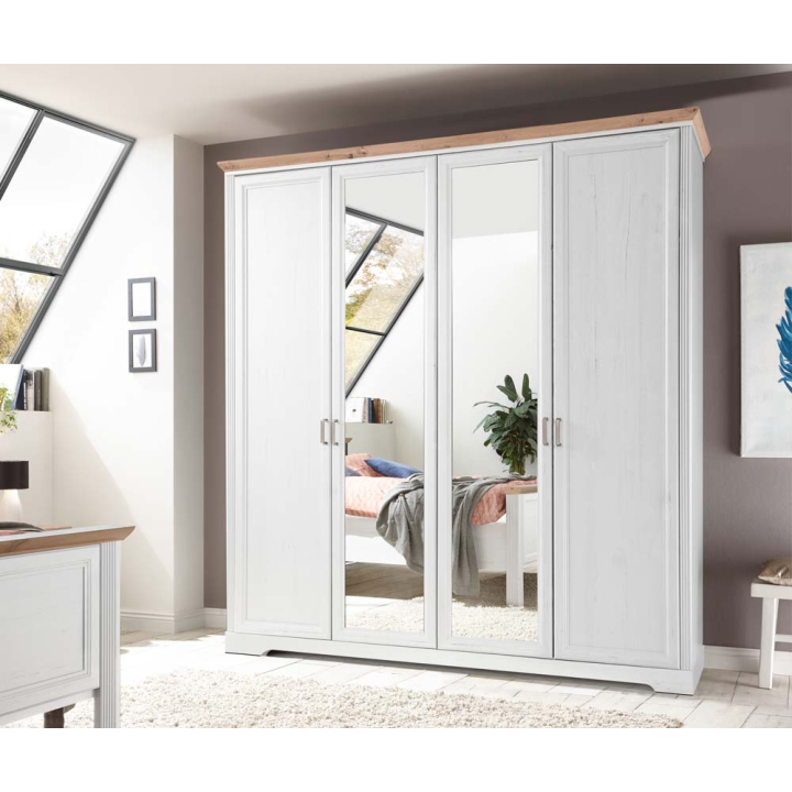 Четирикрилен гардероб с 2 огледални врати в декор бял бор и светъл дървесен декор, с размери Ш:210/Д:64/В:220 см. Отличава се с красив дизайн, като крайните елементи на гардероба са елегантно фрезовани, а вратите са стилно оформени с рамка. Металните дръжки в стил антик, напълно се вписват в цялостната визия на гардероба.