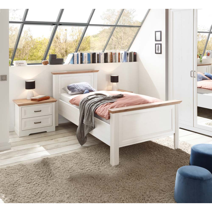 Легло с две табли с размери Ш:124/Д:215/В:98 см. Стабилната конструкция на леглото е произведена за поставянето на матрак 100/200 см, който трябва да поръчате отделно. Леглото може да бъде в бял бор или графитен цвят. Таблите са с декоративна рамка, както и красив корниз в светъл дъбов декор. Към леглото може да добавите и нощно шкафче за съхранението на лични вещи. Красивият дизайн на леглото ще изпълни стаята като лесно може да се комбинира с мебели в други цветове и декори. Висококачествена репродукция на бял бор, представя красивата сърцевината на иглолистната дървесина в бяло-сиви нюанси и светлосиви пукнатини. С лекота добавя усещане за чистота и натурална естественост в помещението. Бялата борова репродукция в комбинация с декоративните улеи, таблите с рамки и корниз, правят модела уникален.