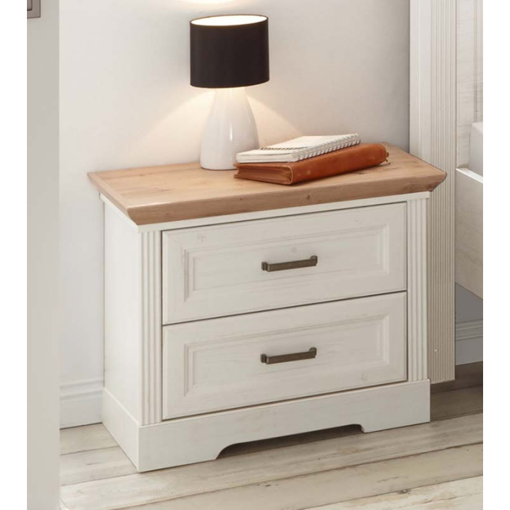 Нощно шкафче с чекмеджета с размери Ш:65/Д:41/В:52 см. Необходимо и функционално обзавеждане за съхранението на лични вещи и аксесоари в спалното помещение. Моделът е съобразен с височината на леглото от комплекта. Притежава красива и стабилна конструкция с компактен плот в светъл дървесен декор, 2 чекмеджета с дръжки тип антик и арт цокъл.