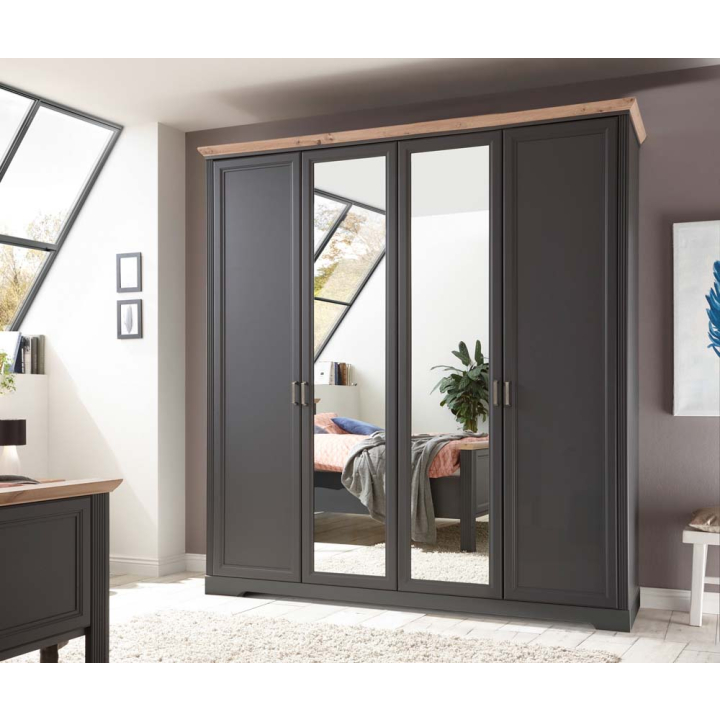 Четирикрилен гардероб с 2 огледални врати в декор графит и светъл дървесен декор, с размери Ш:210/Д:64/В:220 см. Отличава се с красив дизайн, като крайните елементи на гардероба са елегантно фрезовани, а вратите са стилно оформени с рамка. Металните дръжки в стил антик, напълно се вписват в цялостната визия на гардероба.