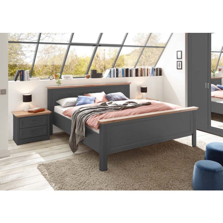 Легло с две табли с размери Ш:204/Д:215/В:98 см. Стабилната конструкция на леглото е произведена за поставянето на матрак 180/200 см, който трябва да поръчате отделено. Леглото може да бъде в бял бор или графитен цвят. Таблите са с декоративна рамка, както и красив корниз в светъл дъбов декор. Към леглото може да добавите и нощно шкафче за съхранението на лични вещи. Красивият дизайн на леглото ще изпълни стаята като лесно може да комбинирате модела с мебели в други цветове и декори. Графитеният цвят е много харесван особено при обзавеждането на луксозни помещения поради своята вродена класа и емоционална умереност, символ на висок стандарт и класа. Графитената текстура в комбинация с декоративните улеи, таблите с рамки и корниз, правят модела уникален.