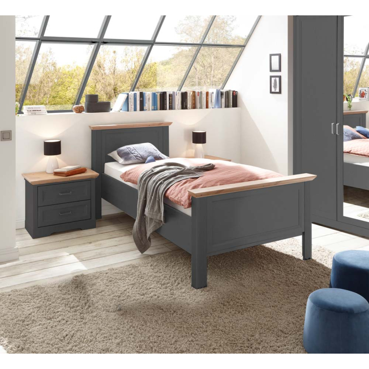 Легло с две табли с размери Ш:124/Д:215/В:98 см. Стабилната конструкция на леглото е произведена за поставянето на матрак 100/200 см, който трябва да поръчате отделно. Леглото може да бъде в бял бор или графитен цвят. Таблите са с декоративна рамка, както и красив корниз в светъл дъбов декор. Към леглото може да добавите и нощно шкафче за съхранението на лични вещи. Красивият дизайн на леглото ще изпълни стаята като лесно може да комбинирате модела с мебели в други цветове и декори. Графитеният цвят е много харесван особено при обзавеждането на луксозни помещения поради своята вродена класа и емоционална умереност, символ на висок стандарт и класа. Графитената текстура в комбинация с декоративните улеи, таблите с рамки и корниз, правят модела уникален.