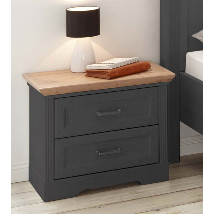Нощно шкафче с чекмеджета с размери Ш:65/Д:41/В:52 см. Необходимо и функционално обзавеждане за съхранението на лични вещи и аксесоари в спалното помещение. Моделът е съобразен с височината на леглото от комплекта. Притежава красива и стабилна конструкция с компактен плот в светъл дървесен декор, 2 чекмеджета с дръжки тип антик и арт цокъл.