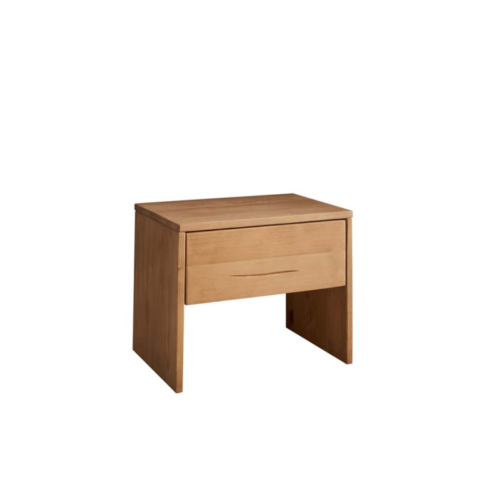 Нощно шкафче с размери Ш:50/Д:35/В:41 см. Конструкция е произведена от масив с чекмедже. Моделът се отличава с компактен плот с овални предни ъгли, чекмедже без дръжки, както и основа с 2 вертикални плоскости. Дървесината е шлифована, специално третирана и моделирана в светъл дървесен декор. Текстурата на дъба впечатлява с красивата си шарка, комбинация между златист и кафяв цвят с откроени фини дървесни извивки. Текстурата на всеки шкаф е абсолютно уникална. Моделът е изцяло произведен от дъбов масив, който се отличава с голяма здравина, плътност и устойчивост.