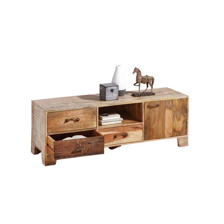 Уникален колекционерски ТВ шкаф, произведен от мангово дърво със загатнати индийски мотиви с размери Ш:148/Д:45/В:50 см. Продуктът се състои от стабилен плот, където повечето телевизори ще намерят своето практично и сигурно място, три чекмеджета с различна големина и разнотипни дръжки, както и едно отделение с врата на панти, за удобното съхранение на всякакви малки вещи, аксесоари и предмети. Комбинацията от текстури на светъл и тъмен дървесен декор стилно допълват цялостната визия на шкафа, като доближават визуален триизмерен ефект, което допълнително подчертава топлия външен вид на дървото. Етническите мотиви са атрактивни и много популярни при производството на мебели, като шкафа е не само удивителен, но със сигурност ще издържи във времето на новите модни тенденции и ще продължи да бъде актуален дълги години. Мебелите произведени от мангово дърво се отличават с голяма здравина и стабилност.