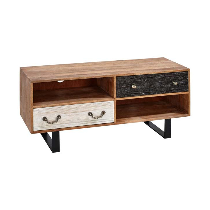 ТВ шкаф с индийски етно мотиви произведен от естествени материали с размери Ш:118/Д:45/В:50 см. Истински шедьовър на мебелната индустрия. Предоставя удобно място за поставянето на телевизор, както и съхранението на лични вещи и малки домашни предмети. Красивият дизайн с етно визия, е не само очарователен, но с лекота пленява и грабва сърцата. Шкафът ще ви върне към отминали времена, когато мебелите бяха несъвършени и уникални. Нещо което си струва да притежавате в новото си жилище. Произведен е от мангово дърво с 2 самостоятелни чекмеджета и 2 отворени ниши. Шкафът е поставен на 2-ва метални крака тип шейна с максимална товароносимост до 75 кг. Шестте чекмеджета са с индивидуална визия, като 2 от тях са с красиви етно орнаменти. На всяко чекмедже са монтирани по 2 дизайнерски метални дръжки (тип копче или висяща метална ръкохватка). Повърхността на шкафа е гладка и леко вълниста, специално третирана и моделирана в светъл дървесен декор. Дъските от мангово дърво са с тъмни чворове на места.