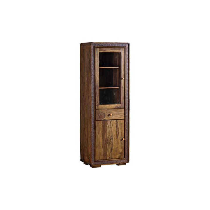 Тази единична витрина, изработена от висококачествен масивен палисандър, съчетава стил и функционалност в един изтънчен мебелен елемент. Дизайнът ѝ включва плътна врата с 1 рафт, осигуряваща дискретно съхранение, както и практично чекмедже за дребни предмети. Витрината е акцент на тази мебел, с три рафта и дървена рамка, идеална за излагане на изискани предмети или декорации.