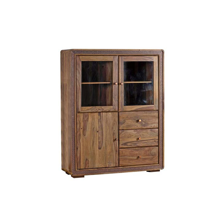Този елегантен и функционален бюфет е изработен от масивно палисандрово дърво, което придава на бюфета топъл, богат цвят и издръжливост. С дизайн, който комбинира практичност и стил, бюфетът разполага с 2 врати – едната е изработена със стъклена витрина, зад която се намира рафт с товароносимост до 10 кг, а другата представлява плътна врата с рафт със същата товароносимост. Между тях са разположени 3 просторни чекмеджета, идеални за съхранение на различни домакински принадлежности.