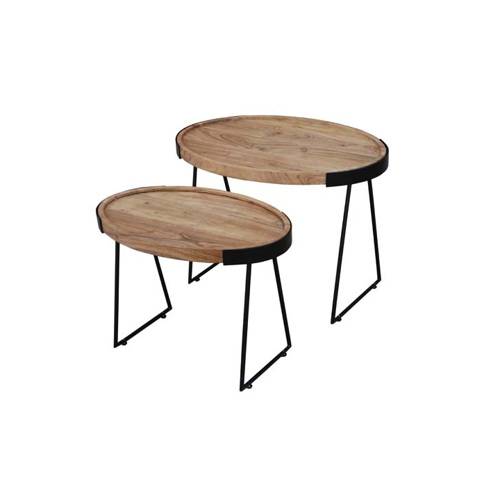 Този елегантен комплект от 2 холни маси, изработени от висококачествено мангово дърво и масивна акация в комбинация с черен метал, съчетава функционалност и изискан дизайн. Масите се събират една под друга, спестявайки място, когато не са необходими, и предлагат практично решение за всеки модерен дом. Със своята уникална визия и топъл дървесен оттенък, те придават свеж акцент и характер в хола.