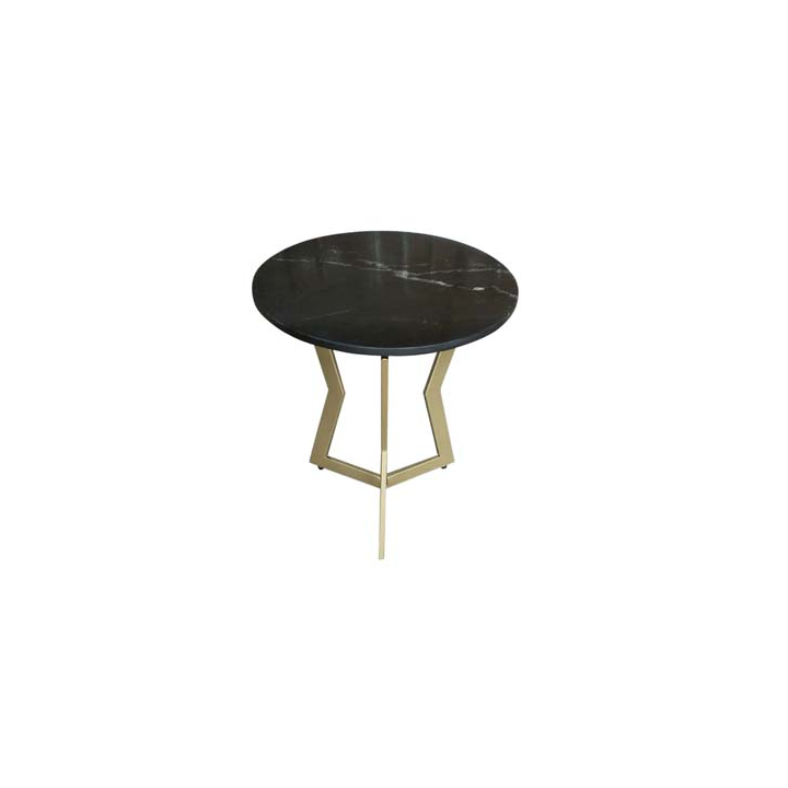 Кръгла холна маса с размери Ш:45/Д:45/В:52 см. Плотът е произведен от черен мрамор, който впечатлява със своята стилна текстура. Черният мрамор e не само класен като визия, но и изключително красив, като впечатлява с лекота със своята текстура. Масата привлича вниманието и със своята метална конструкция, която се състои от 3 обединени в основата крака с протектори щадящи пода. Моделът е с капацитет да настани около 4 човека и максимална товароносимост на плота до 30 кг.