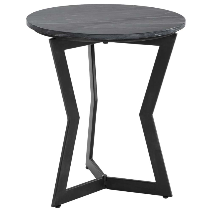 Холна масичка с плот от мрамор, с диаметър - 45 см, притежаващ бели нюанси, които се преплитат, с черната основа, визията се допълва, с 3- те квадратни крачета, с наклонена навътре чупка, което придава на рамката завършен облик. Прахово боядисаните крачета, придават устойчивост на конструкцията.