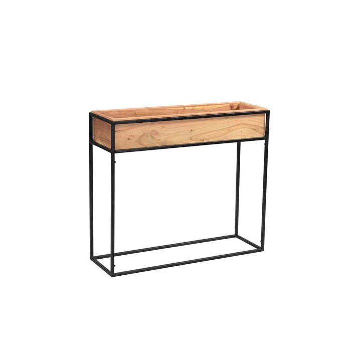 Етажерка е изработена от акациева дървесина, която придава топъл и естествен вид на пространството, докато здравата метална основа в черен цвят осигурява стабилност и изтънчен стил.