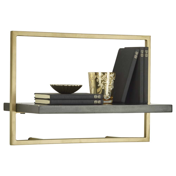 Стилна стенна етажерка от златист метал и черна масивна акациева дървесина, размери: 50/25/35 см
