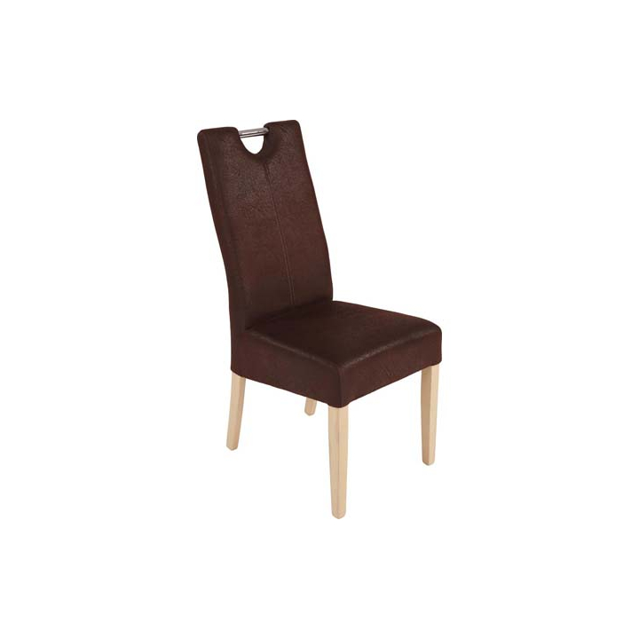 Този трапезен стол е изработен с елегантна визия и съчетава висококачествени материали. Основата и краката са направени от масивна дъбова дървесина в цвят "Дъб Сонома", осигуряваща стабилност и издръжливост. Седалката е тапицирана с текстил в кафяв цвят и предоставя несравним комфорт, а облегалката включва метална дръжка за лесно преместване и стилен акцент.