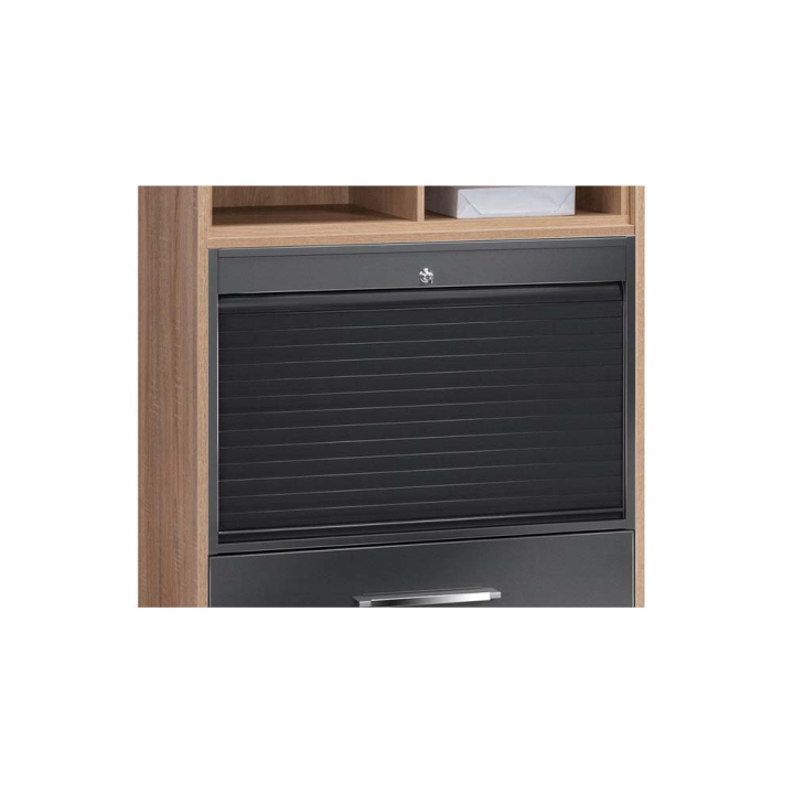 Приставка за етажерка с ролетна врата с размери на продукта Ш:76/Д:39/В:51.4 см. Артикулът е произведен от ПДЧ с меламиново покритие, устойчиво на механични наранявания и влага. Притежава сива ролетна врата произведена от пластмаса, със заключващ механизъм за надеждното съхранението на лични вещи, аксесоари и документи в офиса.