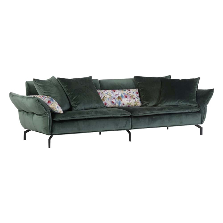 Елегантен 3-ка диван, съчетаващ функционалното и модерното. Диванът е с размери Ш:300/Д:109/В:88-45 см, като със сигурност ще ви хареса просторната седалка, тапицирана с дамаска кадифе с пълнеж от мека PU пяна. Тапицерията е мека на допир, щадяща кожата и устойчива на износване. Възглавниците за облягане са четири на брой, като дори и без тях винаги може удобно да се облегнете на тапицираната облегалка на дивана с пълнеж от PU пяна. Конструкцията е здрава и стабилна произведена от масивна дървесина поставена на шест метални крачета в черен цвят. Подлакътниците са подвижни и са изработени под формата на възглавници, здраво фиксирани към корпуса.
