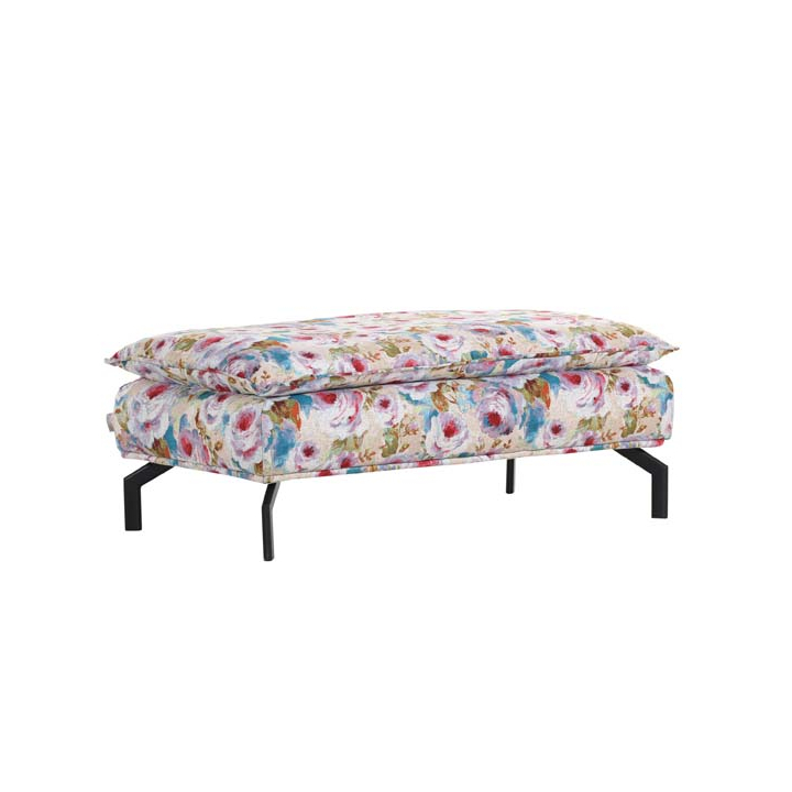 Многоцветна елегантна табуретка с размери Ш:120/Д:70/В:44 см. Със сигурност ще ви хареса просторната седалка, тапицирана с текстилна дамаска с пълнеж от мека PU пяна и вълнообразни пружини. Тапицерията е мека на допир, щадяща кожата, устойчива на износване с красив декор на цветя. Конструкцията е здрава и стабилна произведена от масивна дървесина поставена на четири метални крачета в черен цвят.