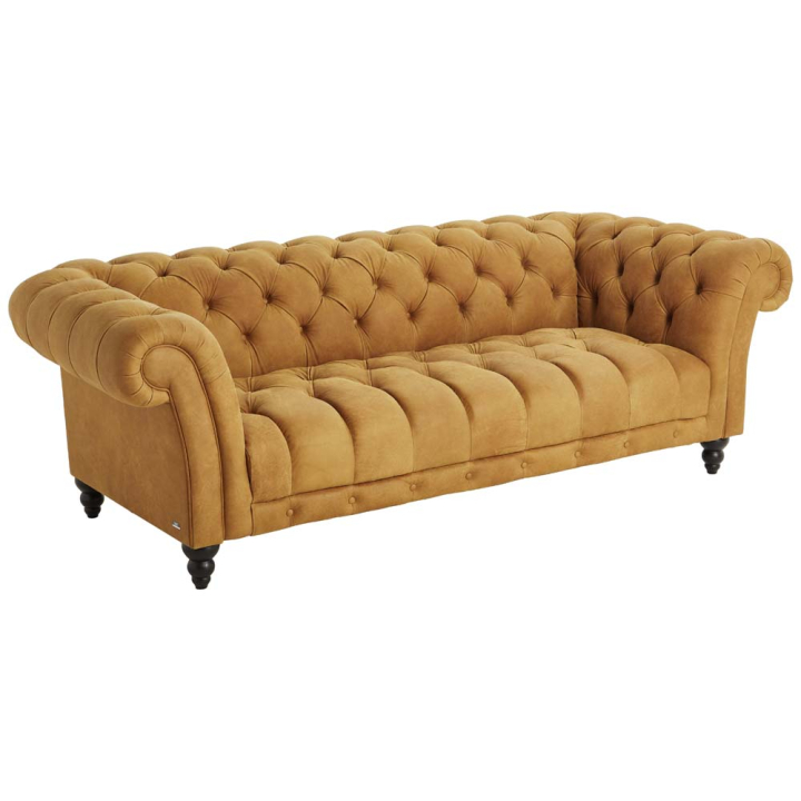 Вашата мечта за перфектния диван се сбъдва: Диван Брадфорд в стил Chesterfield с кожена тапицерия в цвят жълто къри размери: 200/101/74 см