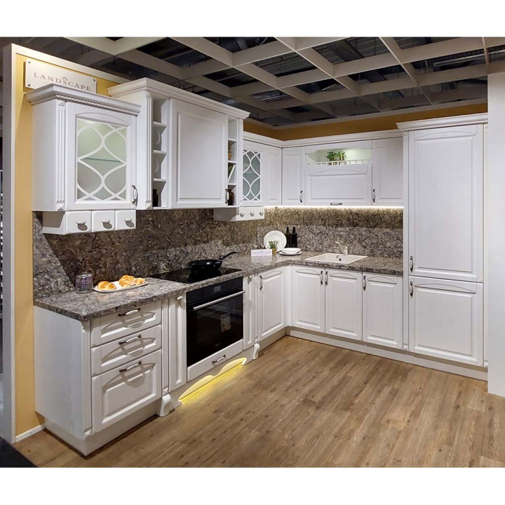 Красива и функционална Г-образна кухня, мечтата на всяка домакиня, произведена в класически дизайн, която винаги ще ви зарежда с положителна енергия. Изработена е с внимание към детайла, от висококачествени материали масив, технически камък и ПДЧ. Атмосферата и усещането за уют, които създават мебелите са несравними. Състои се от плот, стенен панел, горни, долни и високи кухненски шкафове с включена бяла мивка и смесител, както и електроуредите към тях. Особеният чар на мебелите е продиктуван от формата на шкафовете, рамките на вратите, пиластрите, фрезованите крайни елементи, както и корнизите. Стъклените витрини са майсторски изработени с монтирано в тях декоративно LED осветление и стъклени рафтове. Със сигурност ще ви допаднат 6 те чекмеджета под горния ред шкафове, практично разделени в 2 отделни зони, както и 2-те етажерки между шкафа за аспиратор. Вратите и чекмеджета са с мех. за плавно затваряне. Разполага и с 2 чекмеджета за бутилки, както и чекмедже с отделение за съхранение на прибори /вилици, лъжци и ножове/. Голямо предимство на модела е наличието на голяма фурна и ел. керамичен плот с 3 зони за готвене и 4 котлона. Проектирана съгласно правилата за наличие на работно пространство между мивката и електроуредите, кухнята предоставя всичко необходимо, за да приготвите бързо закуски, десерти, основни ястия и/или напитки.