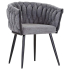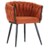 Дизайнерски трапезен стол с размери Ш:60/Д:55/В:78 см. Моделът притежава стилна визия, като със сигурност ще ви направи впечатление облегалката с красива плетеница, която e основната особеност на модела. Столът е произведен с метална рамка и четири стабилни крака, върху която е поставена седалка и облегалка с пълнеж от пяна, тапицирани с текстил 100 % полиестер. Артикулът притежава седалка с дълбочина от 43 см, и височина на седене от 48 см, с комфортни подлакътници с височина от 78 см. Добър избор за обзавеждане, както на дома така, и на рекламни или арт студиа.