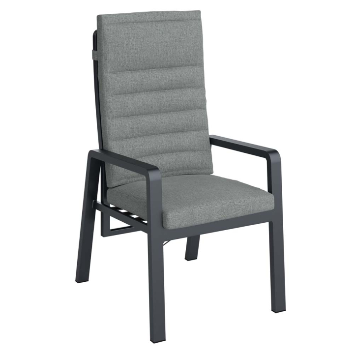 Сив градински стол с подлакътници и висока облегалка, с подвижна възглавница за сядане и облягане, изработен от алуминий и текстил, 72/60/110 см