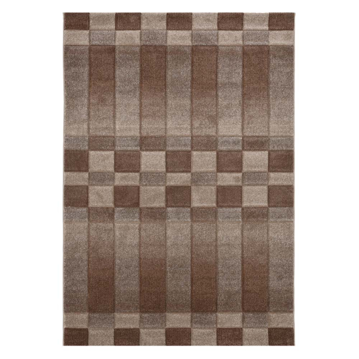Килимът впечатлява с модерен геометричен дизайн в бежово-кафявата гама, съчетаващ вертикални преливки и повтарящи се квадратни мотиви. Балансираната му композиция създава усещане за ритъм и симетрия, като внася топлина и стил във всяко помещение. Килимът е устойчив на износване, петна и деформации, което го прави идеален за натоварени пространства като всекидневна, трапезария или коридор.
