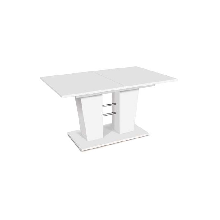 Трапезна маса с разтегателен плот с размери Ш:140-180/Д:90/В:75 см. Моделът се характеризира със съвременна визия и стил, като масата е моделирана и произведена в Германия. Притежава правоъгълен разтегателен плот поставен на конструкция от два модула върху здрава основа. Със своите размери спокойно може да побере от 4 до 6 човека за консумацията на храни и напитки. Плотът на масата може много лесно и бързо да променя своята площ, като по този начин винаги ще има къде да настаните дошлите на гости приятели за вкусен обяд или вечеря. Трапезната маса е произведена от ПДЧ, като може да бъде декорирана в бяло или светъл дървесен декор. Плотът е с дебелина от 22 мм, солиден и много лесен за почистване.