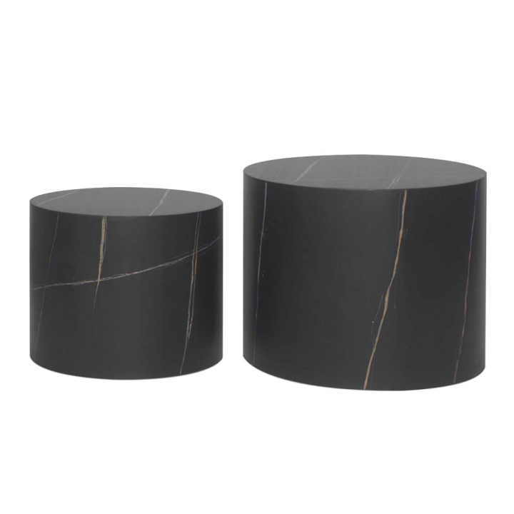 Сетът холни маси Кайро съчетава елегантност и модерен стил в изчистена цилиндрична форма. Плотът с ефект черен мрамор придава изразителен характер, а фините златисти жилки добавят усещане за изтънченост. Комплектът е подходящ както за съвременни дневни, така и за по-елегантни интериорни решения, като масите могат да се използват заедно или поотделно.