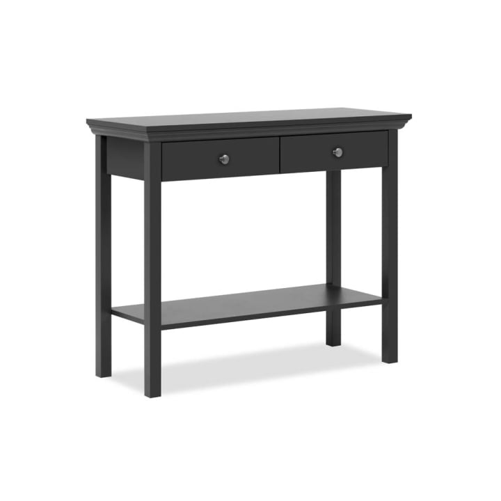 Дървена конзолна маса с размери Ш:90/Д:35/Височина: 75 cm. Прекрасно би стояла, както в спалнята, така и в антрето. Притежава елегантна конструкция с две чекмеджета и стилна фрезовка по периферията на плота. Чекмеджетата са ефикасен помощник за съхранението на всички дреболийки и принадлежности в дома, които винаги лесно ще намирате. Големият рафт в основата на маса е другото удобно място за поставянето на вещи.