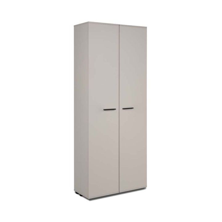 Висок шкаф за обувки с размери Ш:74/Д:34/В:181.5 см. Проектиран е 1 отделение с 5 ниши, както и 2 дълбоки врати с обособени 10 ниши за поставянето на обувки, пантофи, чехли и др. Моделът притежава стилна и изчистена визия, гаранция за приветливата атмосфера заредена с много домашен комфорт. Може да съхранявате удобно около 35 чифта и да подредите всички обувки, боти, пантофи, които ползвате в шкафа. Конструкцията е произведена от ПДЧ в красива текстура, която може да бъде в бяло, бежово или светла дървесна репродукция, особено подходящи за входното помещение. Всеки път когато се приберете в къщи ще бъдете посрещнати от стил и комфорт.