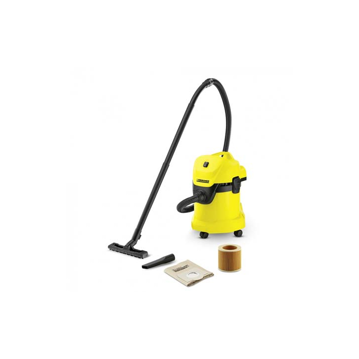 С консумация на енергия едва 1 000 W, WD 3 е също толкова мощна, колкото е 1 400-ватова прахосмукачка. Тази практична прахосмукачка е оборудвана с 17-литров пластмасов контейнер за отпадъци, удароустойчив корпус и патронен филтър Kärcher, подходящ за мокро и сухо почистване без подмяна на филтъра. Филтърът е с високо задържане на прах. Мръсотията няма никакъв шанс. Новоразработената клип система гарантира устойчивост на маркуча, както и оптимално засмукване на всички видове замърсявания. По този начин WD 3 дава отлични резултати с оптимално почистване. Аксесоарите се съхраняват практично на интегрирани за това места. Паркинг позицията осигурява лесно съхранение на минимално място. Като допълнителна екстра е функцията издухване, ''Pull & Push'' заключваща система, ергономична дръжка за носене и практично съхранение на кабела и аксесоарите.