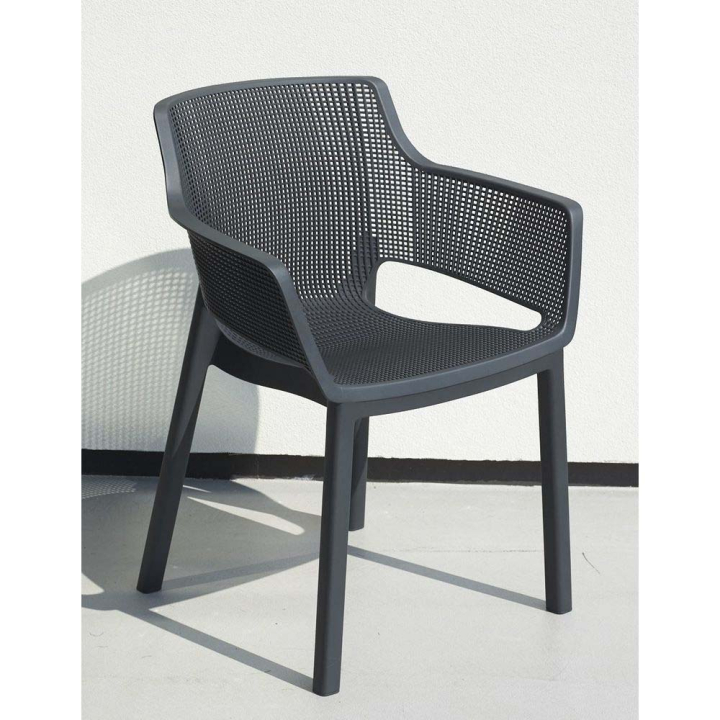 Елегантен и практичен стол, изработен от висококачествена пластмаса в тъмносив цвят.