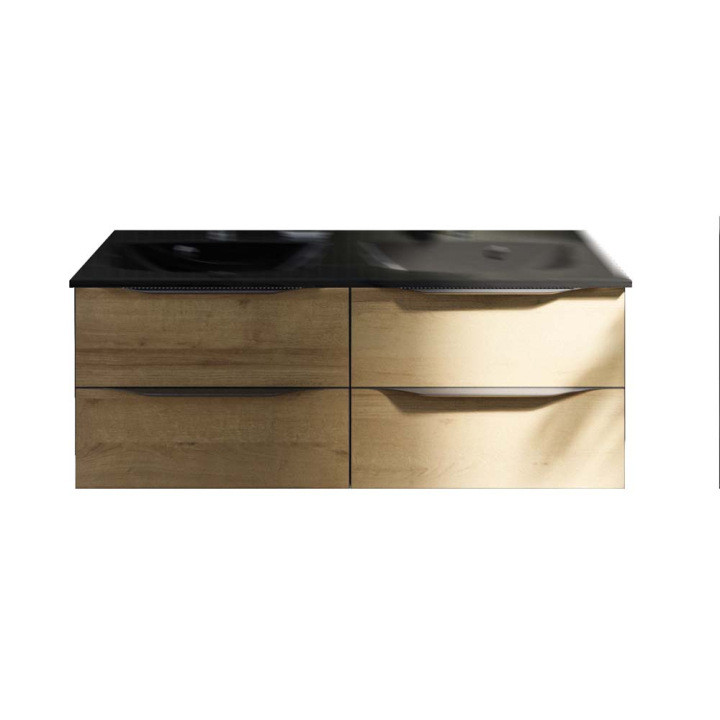 Луксозен шкаф за баня с размери Ш:130/Д:46/В:48.2 см. Моделът е подходящ за обзавеждане на по-просторни бани, като предоставя възможност удобно да бъде ползван от двама партньори едновременно. Шкафът е произведен в Германия от висококачествени материали, влагоустойчиво ПДЧ с меламиново покритие в светъл дървесен декор, красива репродукция на дъб. Притежава четири чекмеджета с механизми за плавно затваряне, където надеждно може да съхранявате предмети, които традиционно държим в банята. Дизайнерите са помислили специално за дамите, като в най-горното чекмедже е поставен органайзер за козметика. За да бъде окомплектован, към шкафа трябва да поръчате двойна мивка, (94462010633).