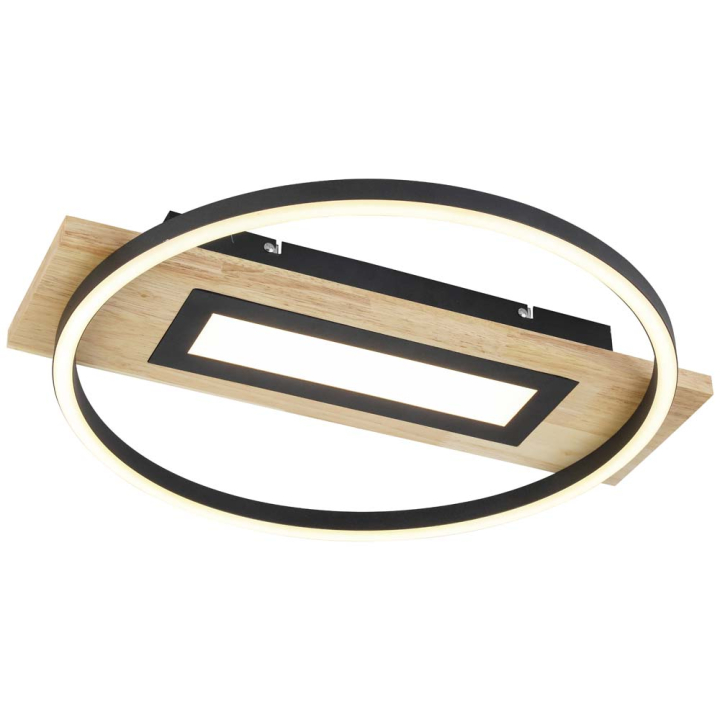 LED плафониерата впечатлява със своя изискан, дървесен вид и геометрични форми. Подходяща е за всяка трапезария и всекидневна, а с температурата си от 3000К топло бяла светлина внася уют и настроение.