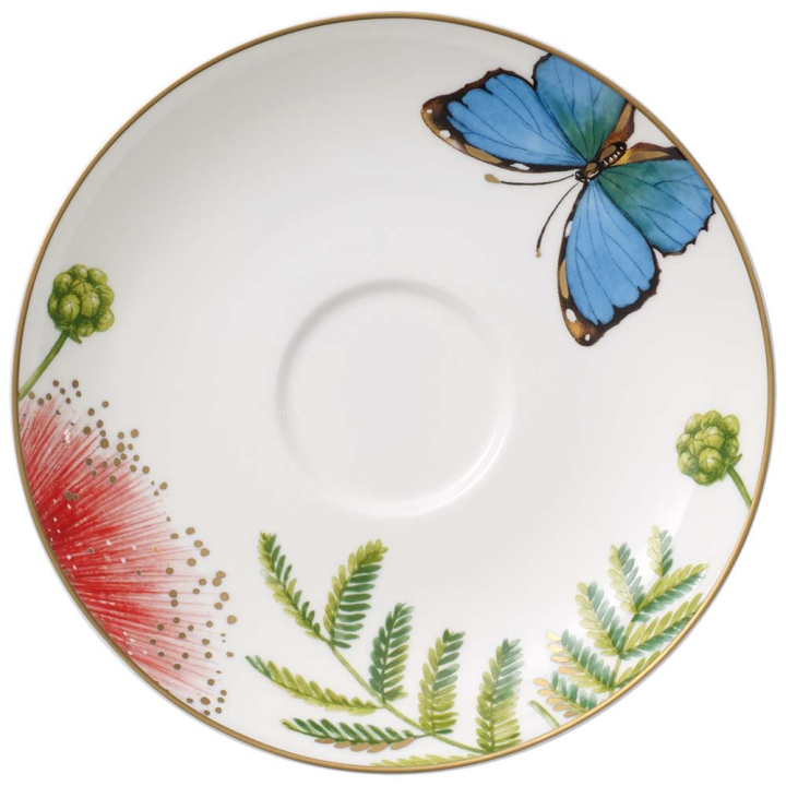 Красивата чинийка от колекция Amazonia на Villeroy&Boch е изработена от първокласен костен порцелан в цветен дизайн. Декорирана е с екзотичен мотив с фина златна линия.