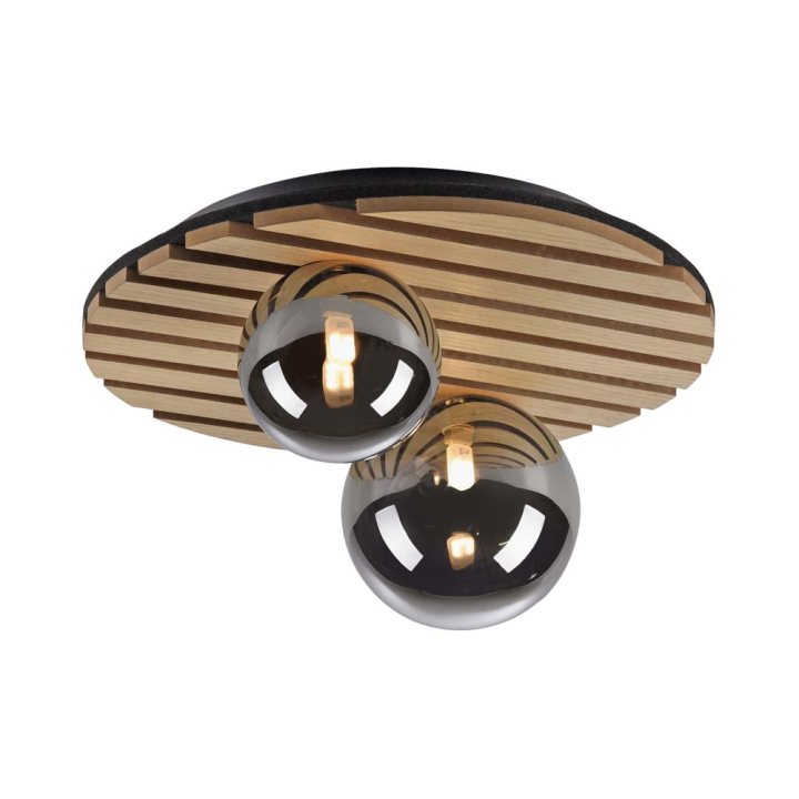 Тази плафониера е изработена от дъбова дървесина в светъл цвят с интересно очертани детайли. Топлото въздействие е подсилено от черният филц, който подобрява акустиката на помещението, потискайки смущаващите шумове. Двете сфери от опушено стъкло хармонично завършват композицията.
