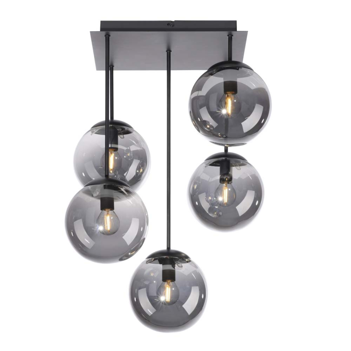 Елегантната таванна лампа BIG WIDOW в черно ще накара всяко пространство в дома да заблести. Светлината се отразява декоративно през опушените стъкла на абажурите. Петте стъклени тела се държат от метални пръти с различна дължина. Тази визия създава модерна и уютна визия. Лампата може да бъде оборудвана с пет крушки Е14 с максимална мощност 25 вата.