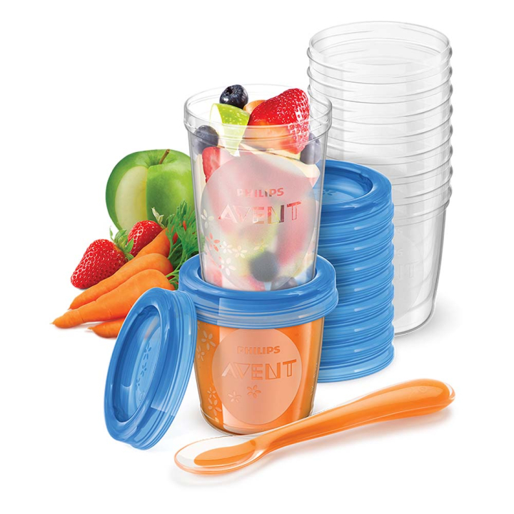 Кутиите са подходящи за съхранение във фризер или хладилник, както и за използване в нагревател за бутилки, стерилизатор, микровълнова фурна и съдомиялна. Комплектът включва и лъжичка, с която малчуганът да се приучава към домашно приготвената храна.