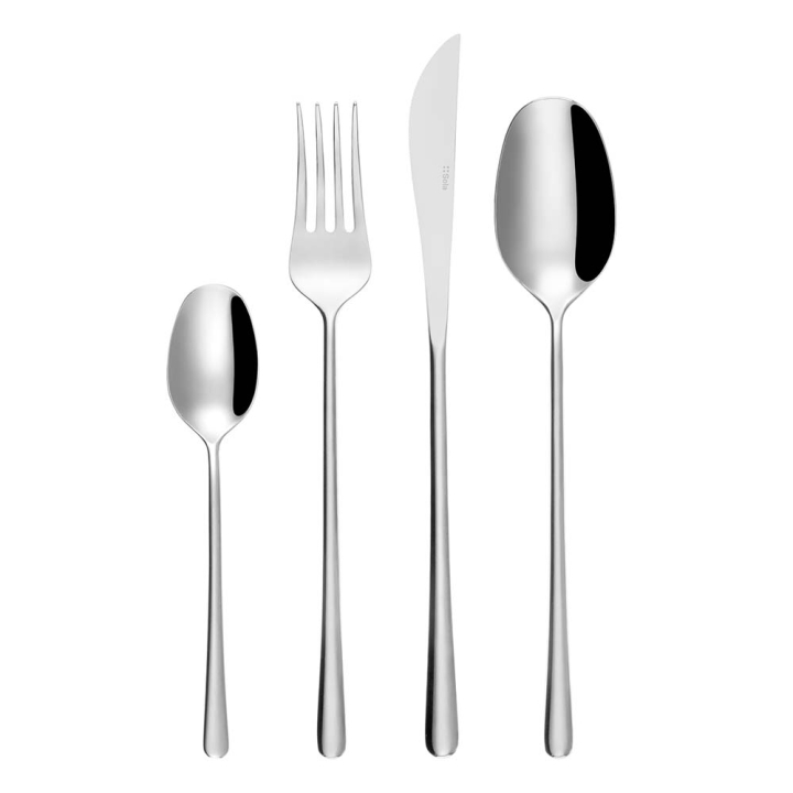 Комплектът съчетава деликатна форма и извивки с модерен стил. Линиите и цялостното покритие с огледален ефект придават на приборите изискан вид, който се съчетава идеално с различни стилове на подреждане на масата – от минималистичен до празничен. Благодарение на добре балансираната си форма, приборите за хранене са изключително удобни за ползване.