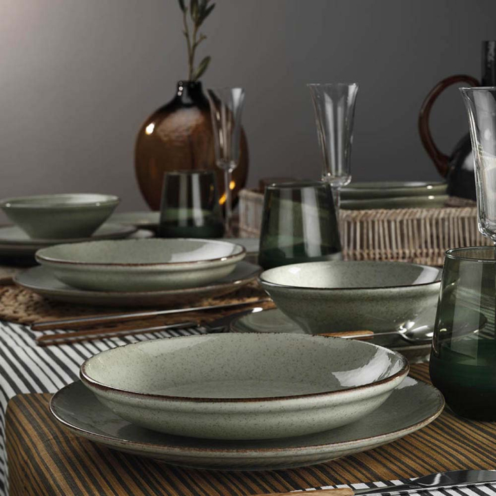 Вдъхновен от чистата и естествена структура на порцелана, този комплект за 6 човека подарява незабравими моменти по време на сервиране. Уникалният ментов нюанс на зеленото е съчетан с деликатна декорация и перлен отблясък на глазурата. Визията се отличава, насочвайки сетивата към магията на природата с непринудена и семпла натуралност.