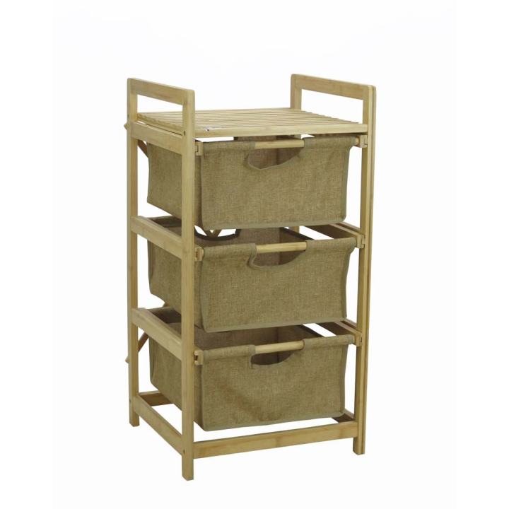 Триредова етажерка от бамбук с размери на продукта Ш:39/Д:36/В:75 см. Етажерката е произведена от висококачествени естествени материали, което я прави изключително здрава. Бамбуковата рамка на етажерката е много стабилна, устойчива на механични наранявания, както и раздуване от влага. Притежава компактен решетъчен плот, където удобно може да поставите ваза с цвете или красива статуетка. Освен функционална, етажерката от бамбук ще добави нотка екзотика към помещението, като със своите 3 коша предостави възможност за съхранението на малки предмети, лични вещи и аксесоар. Бамбуковата конструкция е в светъл дървесен декор с гладка повърхност. Текстилните кошове са с дръжки, поставени на релси за удобното им изваждане и прибиране в етажерката. Етажерката може да бъде поставена почти навсякъде в дома според вашите лични желания и потребности.