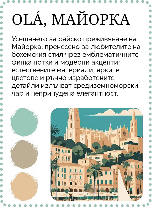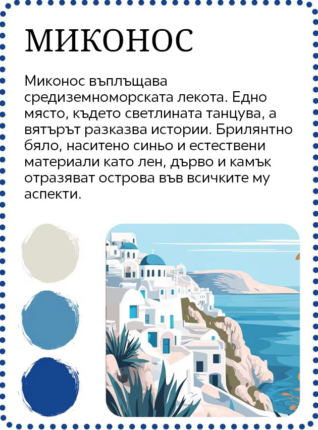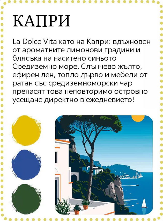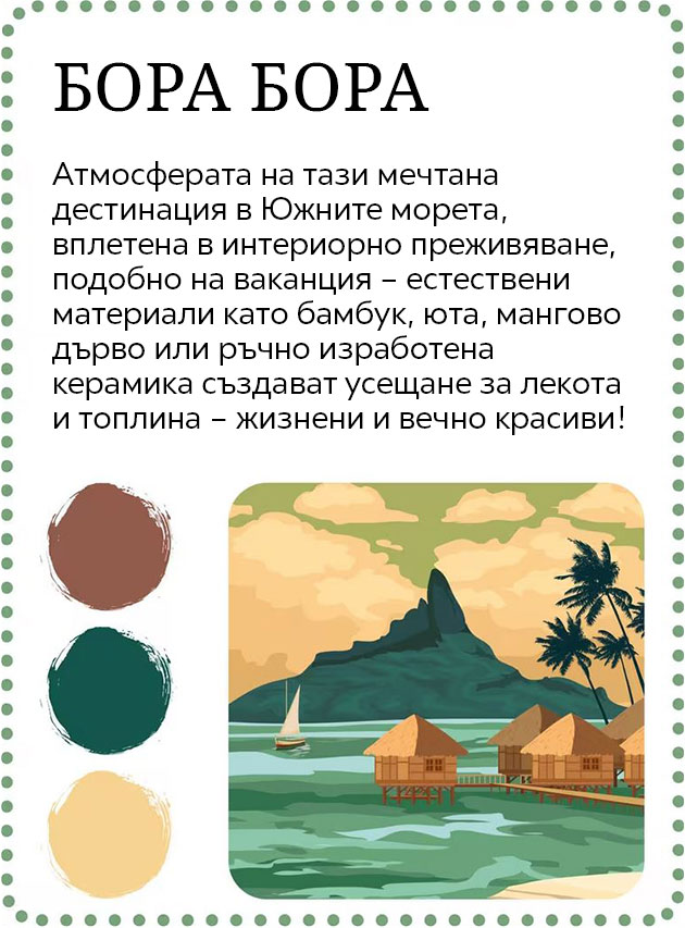 Усещането за ваканционна лекота и безгрижие не е задалжително да бъде свързано с пътуване и планирана почивка. С малко вдъхновение можем да претворим домашния уют и да вплетем нишките на ванакционното удоволствие в ежедневието ни. А дестинациите са безброй – от Миконос, до Бора Бора, през африканската екзотика, до бохемския шик на Майорка!